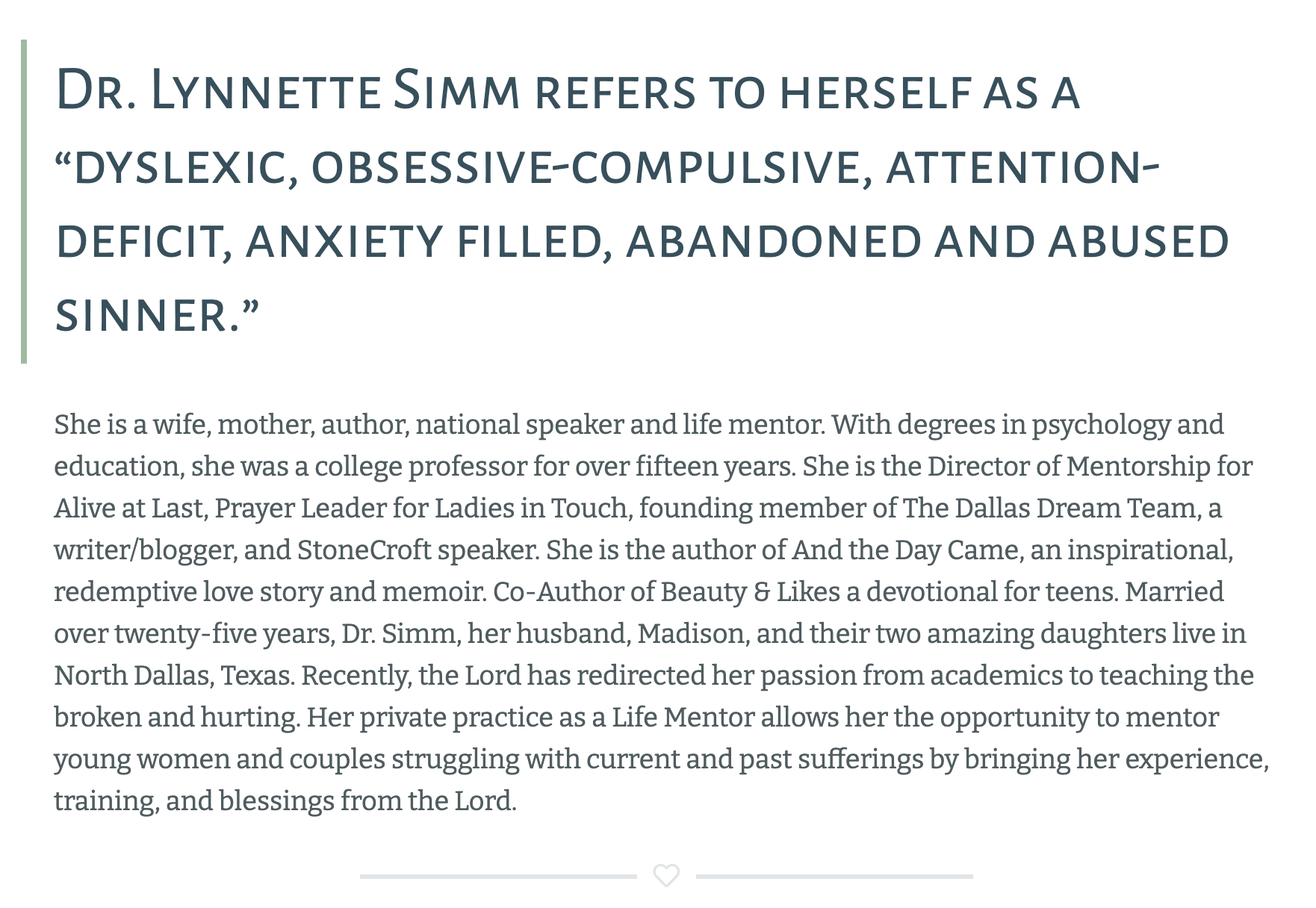 She co-produced Tear Stained Forgiveness: Finding Hope and Restoration After Abuse, a documentary about her family’s healing. Married nearly twenty-five years, Dr. Simm, her husband, Madison, and their two amazing daughters live in North Dallas, Texas. She currently works as a Life Mentor for the Alive At Last nonprofit organization, helping young women and couples struggling with current and past sufferings by bringing her experience, training, and blessings from the Lord.